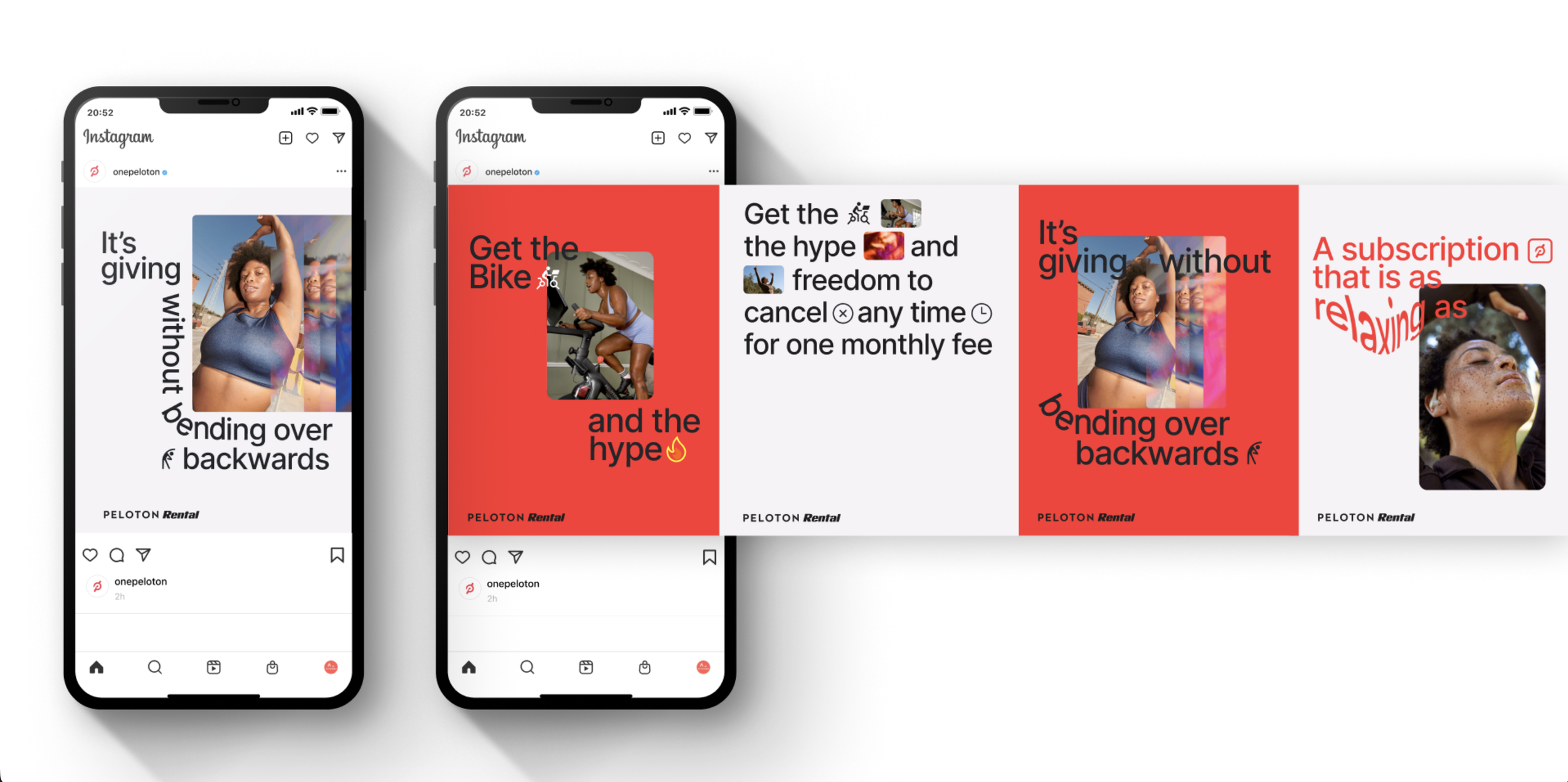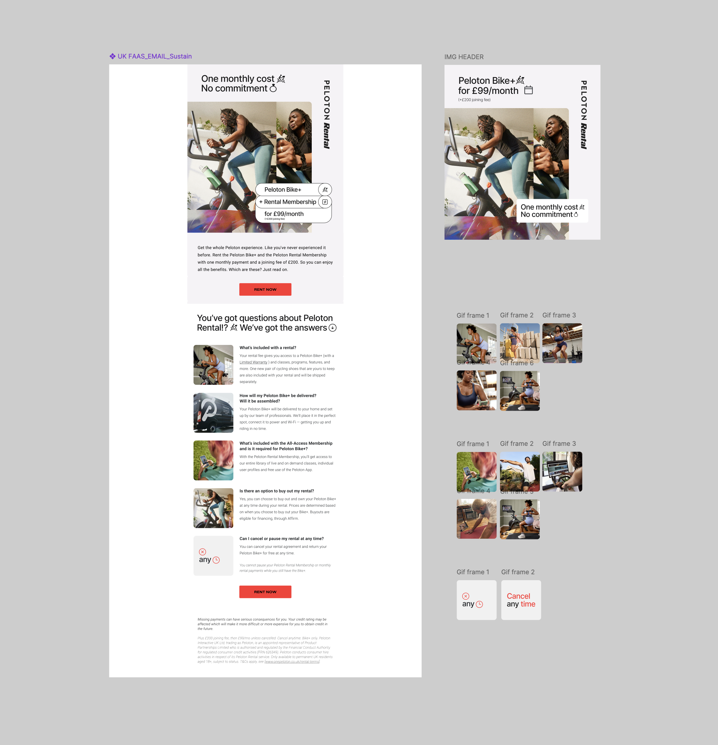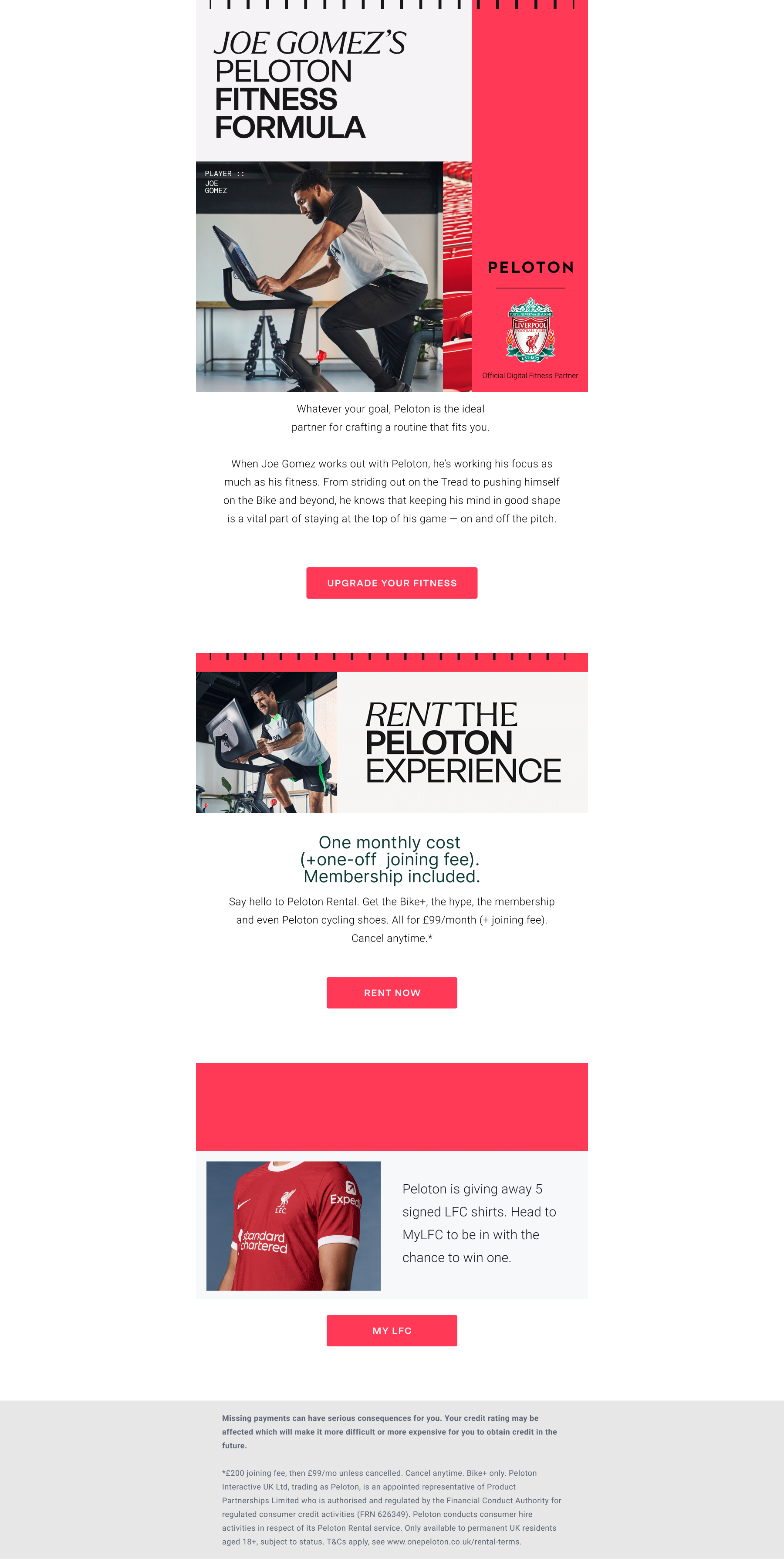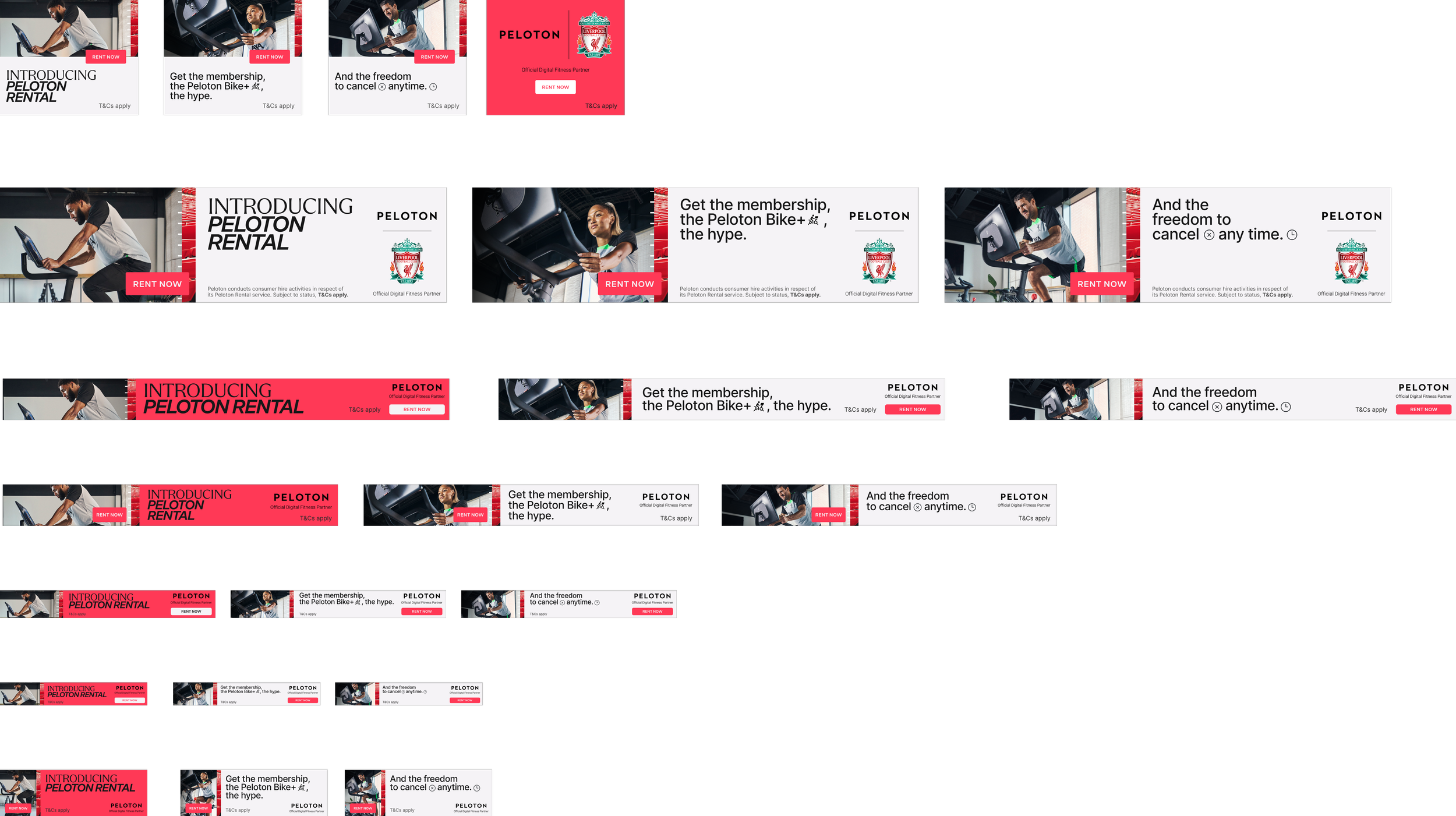 We also extended Peloton Rental (FaaS) into our Liverpool FC partnership communications, which meant holding two visual systems in dialogue with each other. We reworked the Rental identity to converse with the partnership language we'd developed for Liverpool, finding a balance that stayed true to both — playful enough to feel like FaaS, rigorous enough to feel like Liverpool.