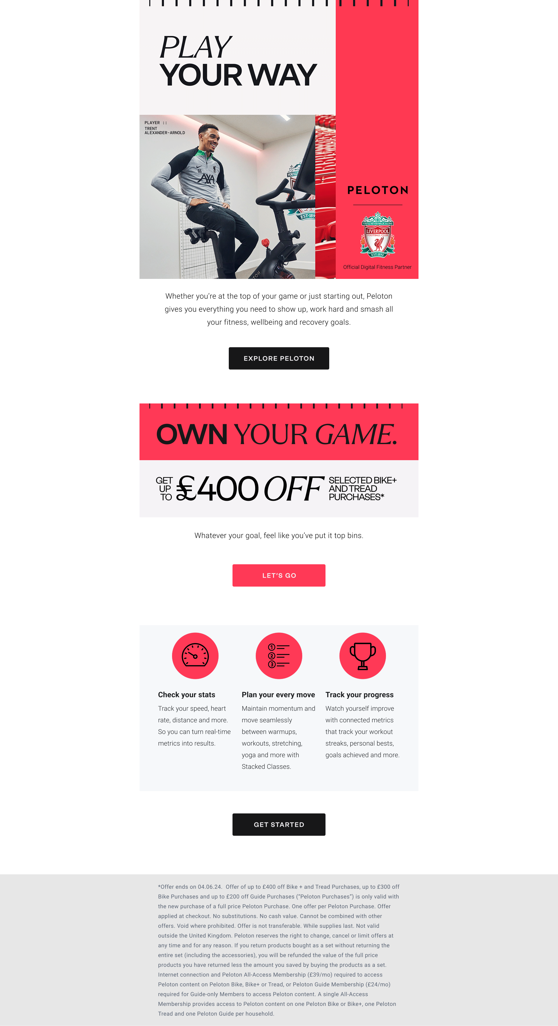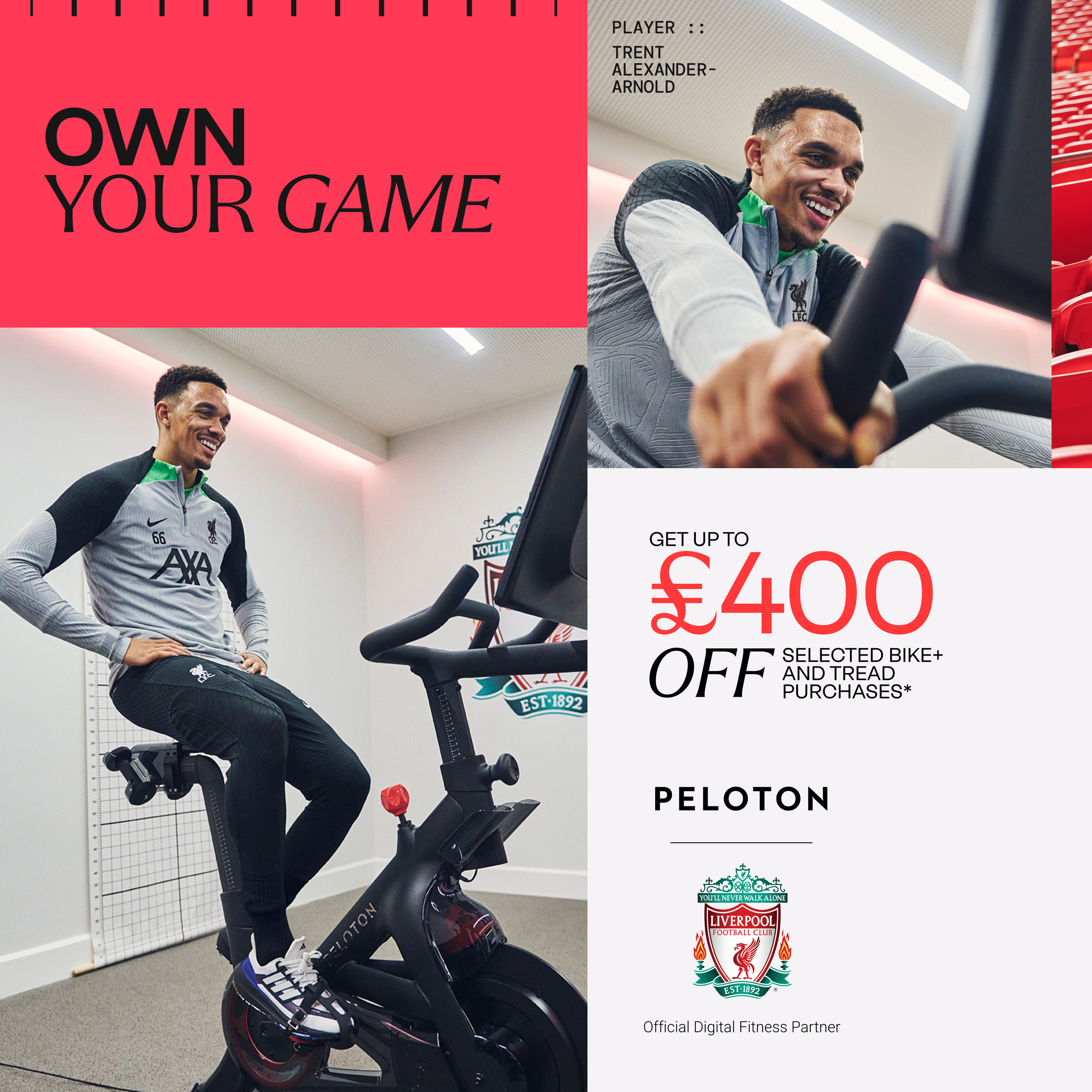 The Peloton Rental campaign went live in April 2024, working across CRM, paid social, organic and web. From there, the system extended further into Peloton's annual May Promo, extending the FaaS and Liverpool visual systems into a broader sales moment. We fronted it with the player Trent Alexander-Arnold — capturing the campaign shots in a 3-minute shoot window on the back of an audio class Peloton had just recorded with him. Low lift, high relevance, and a sharper example of how the system could scale.